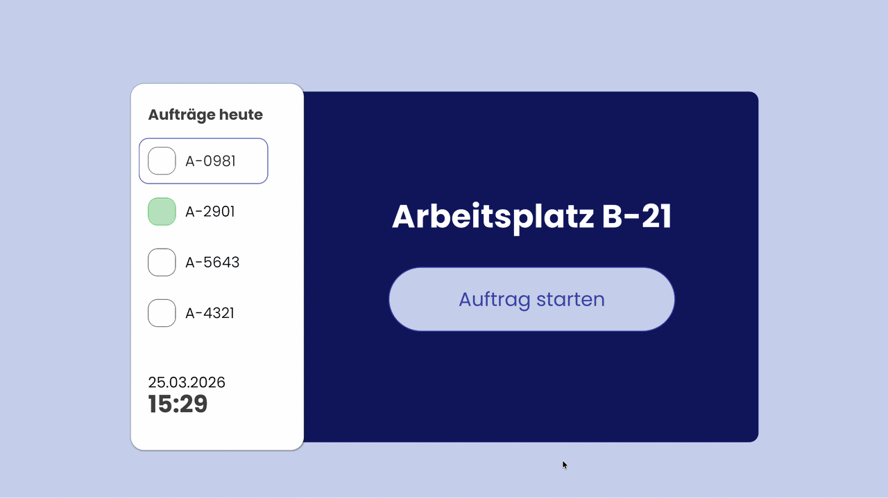 Der Benutzer wählt eine Bestellung aus, und die Uhr beginnt zu laufen. Die Produktion wird direkt über die Benutzeroberfläche gesteuert, indem die Anzahl der zu produzierenden Teile durch einfaches Tippen erhöht wird. Eine grafische Darstellung der Arbeitszeit und des Arbeitsfortschritt gibt Einblick in die Performance der Mitarbeiter.